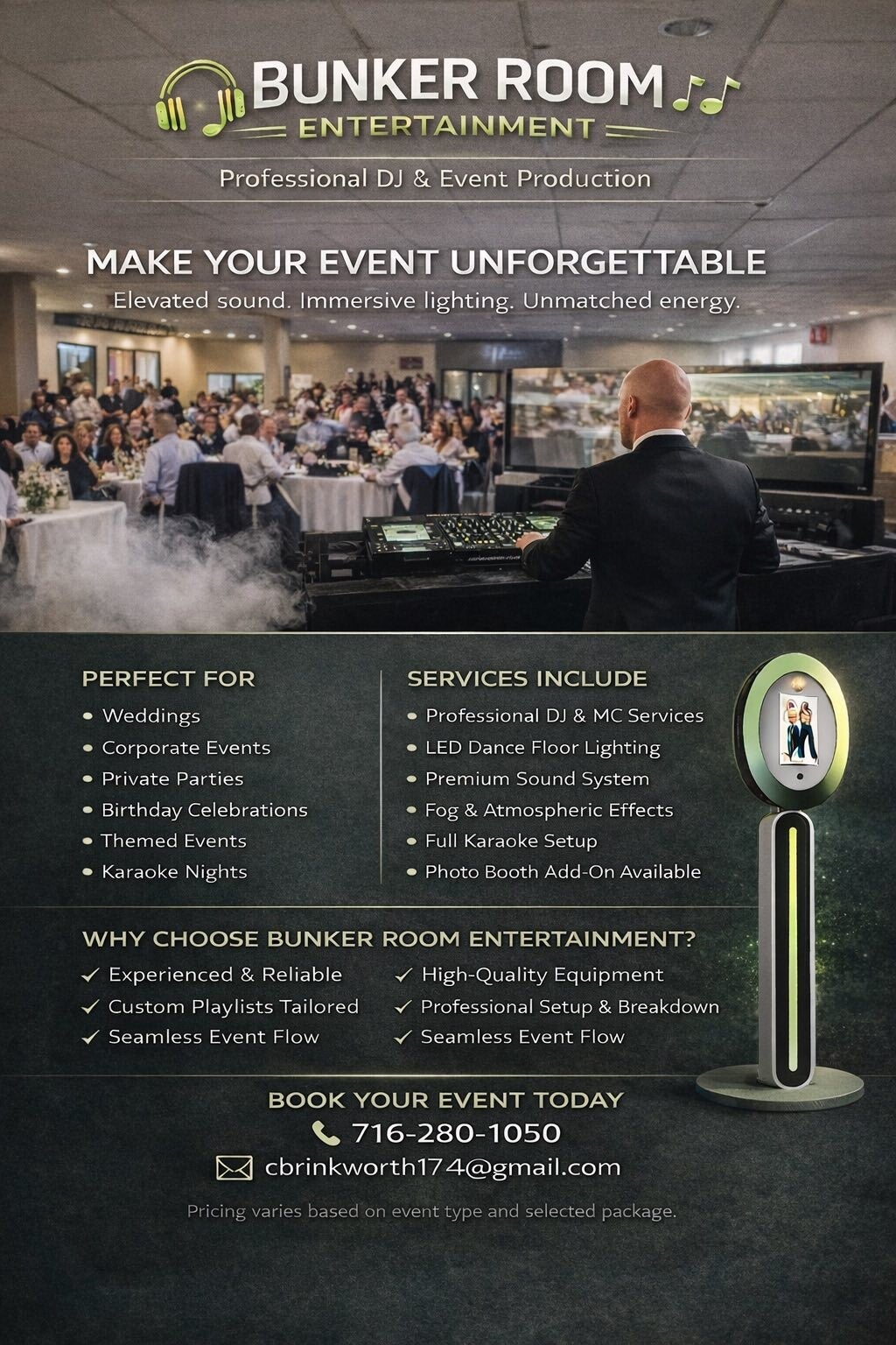 Welcome to Bunker Room Entertainment, your go-to source for your DJ services in Niagara County, New York. My goal is to provide dedicated unforgettable experiences for weddings, private parties, and bars.